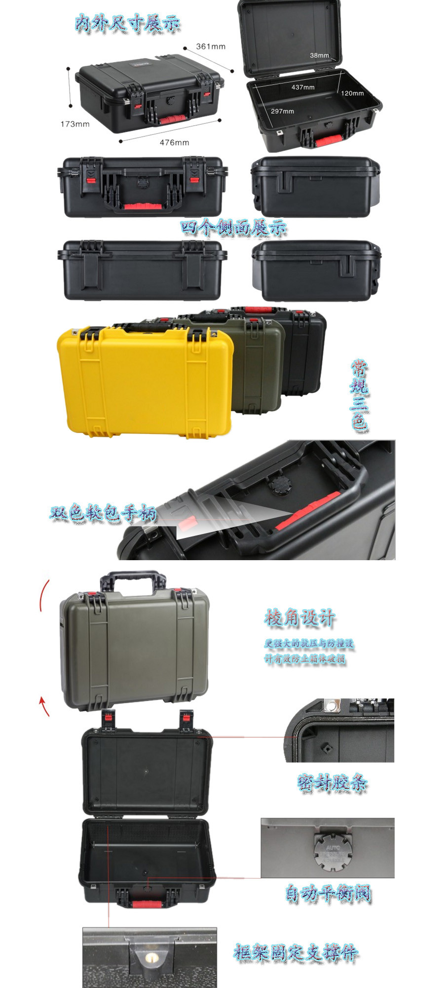 簡要說明:廣泛用于傳媒、公安、消防、軍隊、航空、戶外攝影、野外考察、科學(xué)探測等眾多領(lǐng)域的高端儀器、儀表。具有高強度、高抗壓沖擊、防潮、絕對密封、防塵、防水等特點。產(chǎn)品材質(zhì):ABS原料,箱體采用高抗沖擊的高分子聚合材料一體注塑成型,密封采用扁型彈性發(fā)泡密封橡膠條,確保防水氣密,所有較軸均采用不銹鋼材質(zhì)。