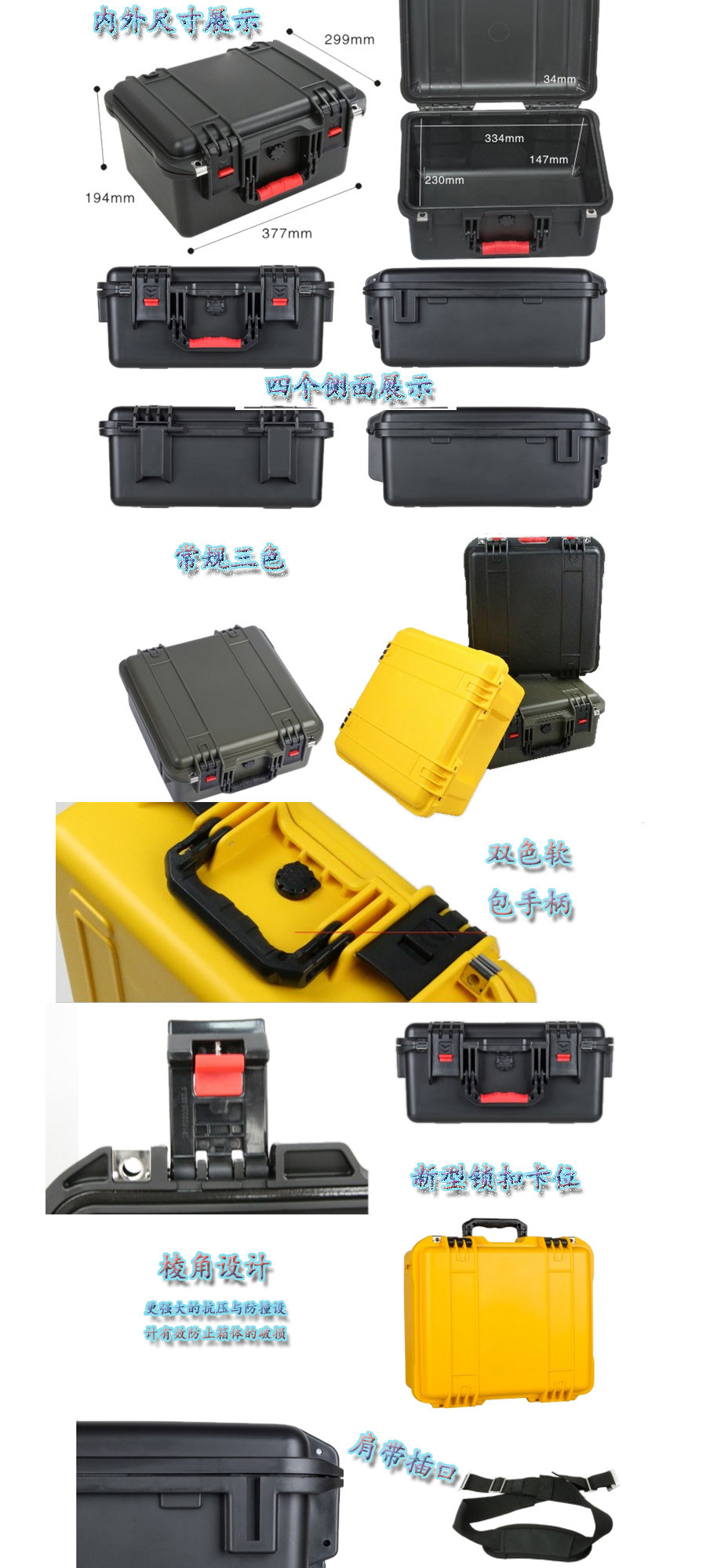 簡(jiǎn)要說(shuō)明:廣泛用于傳媒、公安、消防、軍隊(duì)、航空、戶外攝影、野外考察、科學(xué)探測(cè)等眾多領(lǐng)域的高端儀器、儀表。具有高強(qiáng)度、高抗壓沖擊、防潮、絕對(duì)密封、防塵、防水等特點(diǎn)。產(chǎn)品材質(zhì):ABS原料,箱體采用高抗沖擊的高分子聚合材料一體注塑成型,密封采用扁型彈性發(fā)泡密封橡膠條,確保防水氣密,所有較軸均采用不銹鋼材質(zhì)。